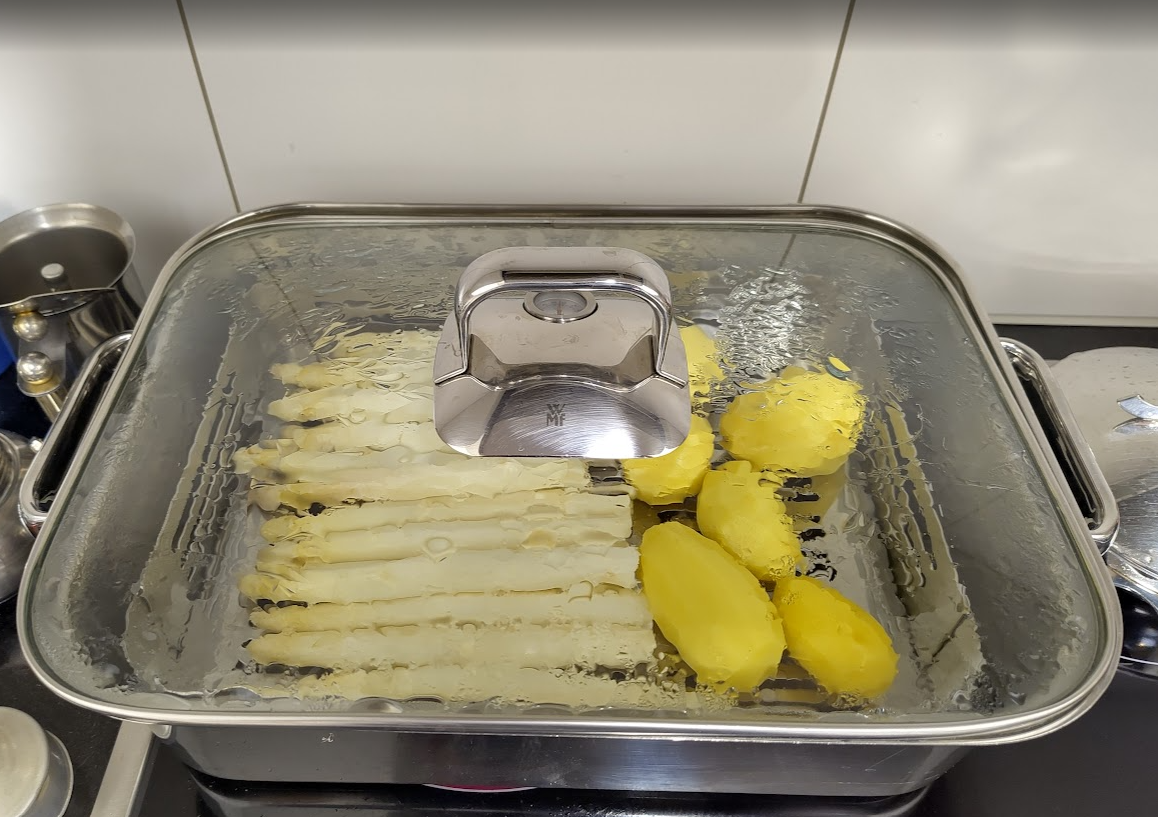 Als Beilage serviere ich Spargeln mit Kartoffeln. Leider habe ich vergessen, Sauce Hollandaise zu kaufen. ChatGPT hilft: